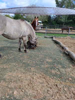 Auf den Paddocks steht den Pferden Raufutter in Raufen zur freien Verfügung.