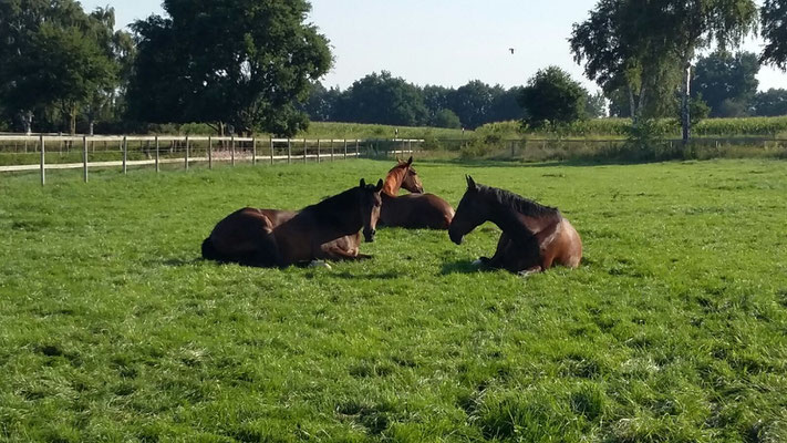 Es stehen ausreichend Weideflächen zur Verfügung. Die Weiden sind mit Beoband und Elektrozaun eingezäunt. Die Pferde werden von uns nach Stuten und Wallachen getrennt auf die Wiese oder aufs