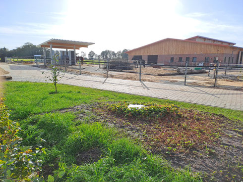 Der Boden ist überall befestigt, d.h. matschfrei. Wir haben für eine gute Hufgesundheit fast 10 verschiedene Bodenbeläge, die auch zum Toben, spielen und wälzen einladen. Unsere Anpflanzungen werden stetig erweitert, gepflegt und wachsen, um den Pferde noch weitere Schattenplätze zu bieten. An der Lecksteinbar findet jedes Pferd die passenden Mineralien, die Asthecke lädt zum Knabbern ein und es gibt verschiedene Scheuermöglichkeiten. Durch die große Gruppe findet jeder seinen passende/n Freund/e und Spielkameraden.