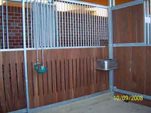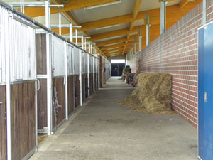 Der Stall ist direkt an die Reithalle angeschlossen. Jede Box hat Fenster nach draussen und zur Stallgasse. Die Pferde haben durch die Trennwand ständig Kontakt zum Boxennachbarn und können auch beobachten, was draussen vor sich geht. Um in Ruhe fressen zu können ist im Bereich des Futtertroges die Trennwand geschlossen.